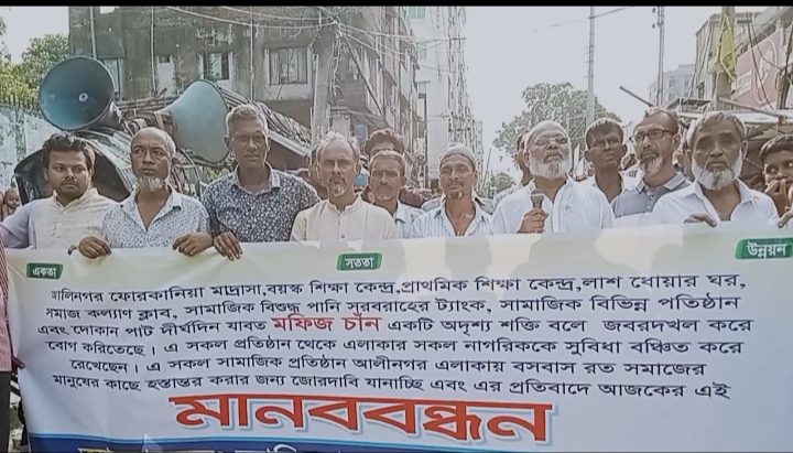চট্টগ্রাম মহানগরের বায়েজিদ থানাধীন আলীনগর এলাকায় রাজনৈতিক প্রভাব খাটিয়ে সামাজিক ক্লাব, লাশ ধোয়ার ঘর, ফোরকানিয়া মাদ্রাসা,বিশুদ্ধ পানির ট্যাংক, পাবলিক টয়লেট জোর পূর্বক দখলের প্রতিবাদে মানববন্ধন করে আলীনগরবাসী।